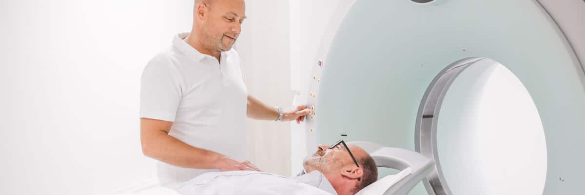The core technology of computed tomography is X-ray technology. However, during CT examination X-ray pictures are taken from different directions. The X-ray tube and detectors rotate around the person and record up to 64 layers at the same time at high speed thanks to multislice spiral CT technology. High-performance computers compose anatomical images from these single layer data sets. The CT of Beta Klinik adapts the radiation dose automatically in real time during a CT examination. This makes the best radiation dose for every individual patient possible. Sometimes, it can be crucial to use a contrast agent in order to make specific characteristics of a certain tissue visible that would simply be invisible without it. Depending on the region to be examined, this contrast agent has to be administered orally, intravenously or intra-thecally (in the dural sac/spinal canal, e.g. in case of conventional myelography or CT myelography). If you have to take it orally, for example, you drink a certain amount of contrast agent before the examination. Since CT contrast agents contain iodine, the intravenous application can cause an (pseudo-)allergic reaction. Therefore, it is important to answer a few questions before the examination, also to figure out if you are allergic to iodine.