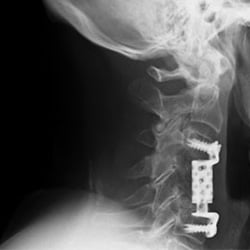 The image on the left is detail of an x-ray image created after cervical spine surgery. Postsurgically, it was crucial to assess the adequate position of the vertebral body replacement.
